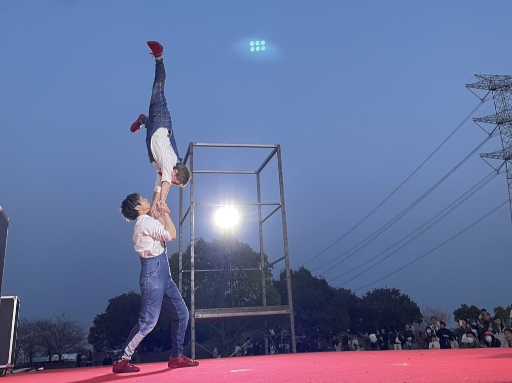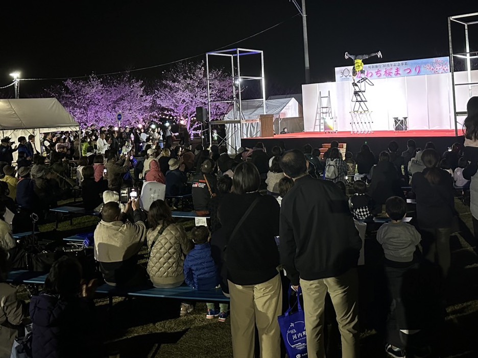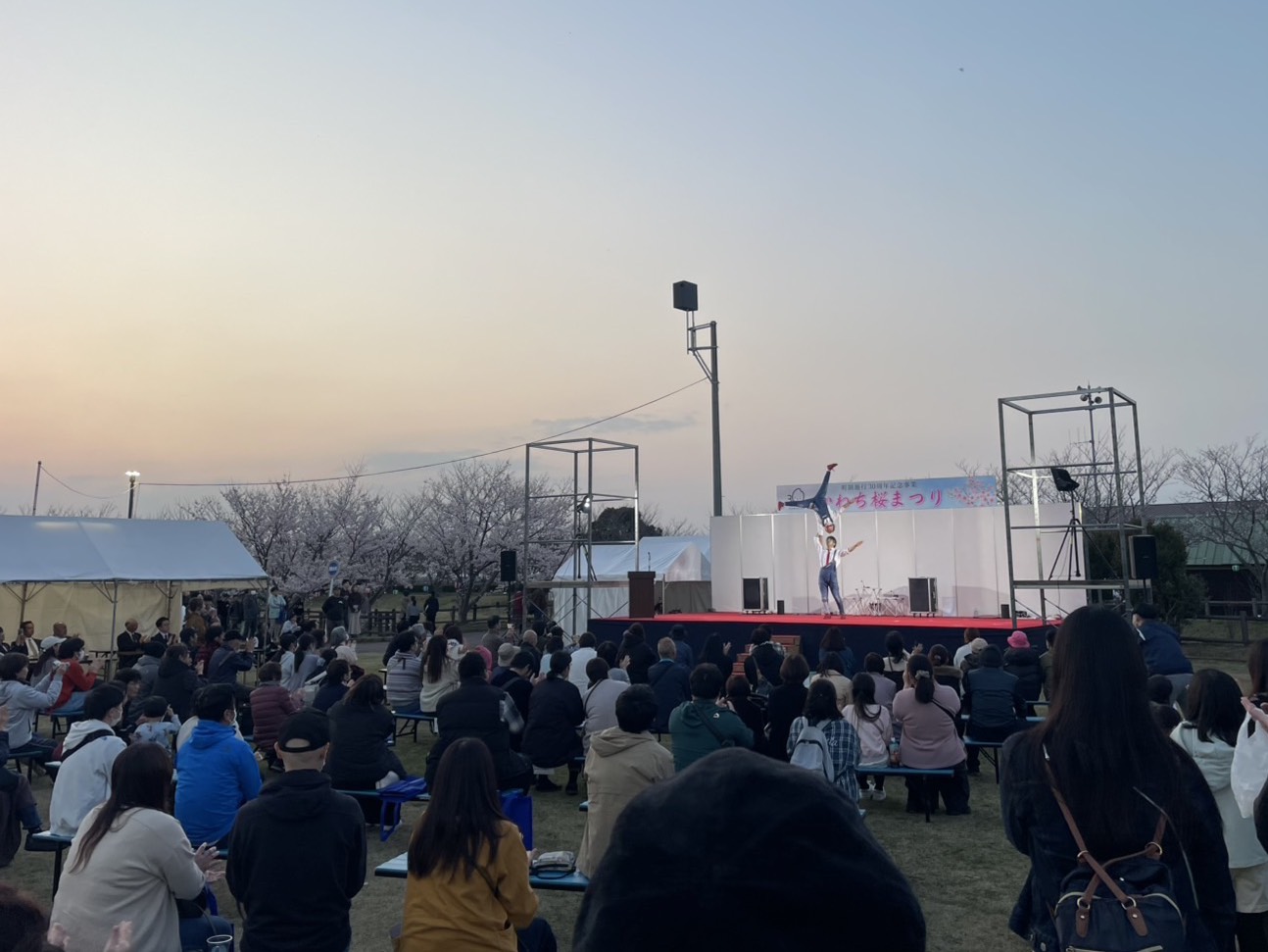 茨城県かわち桜まつり2026のライトアップ点灯式のオープニングセレモニー前の時間、メインステージで30分間のアクロバットショーをお届けしました。