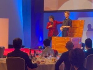 先ずはステージでイリュージョンショーを塚原ゆうきさんとSOUさんが10分程行いました。30周年を向かえた企業様の社長様とステージ上で一緒にマジックを行ったり、最後は塚原さんと SOUさんの息のあったイリュージョンを披露して、会場内も歓声と拍手で盛り上がっていました。