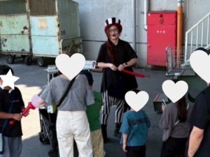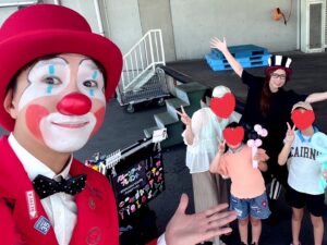 1回目のグリーティングではお子様に高身長&ピエロ姿が怖がられてしまいましたが、その後ショーを演じたことにより、子ども達が打ち解けてくれて、2回目のグリーティングでは、子ども達から近づいてきてくれるまでになりました。
